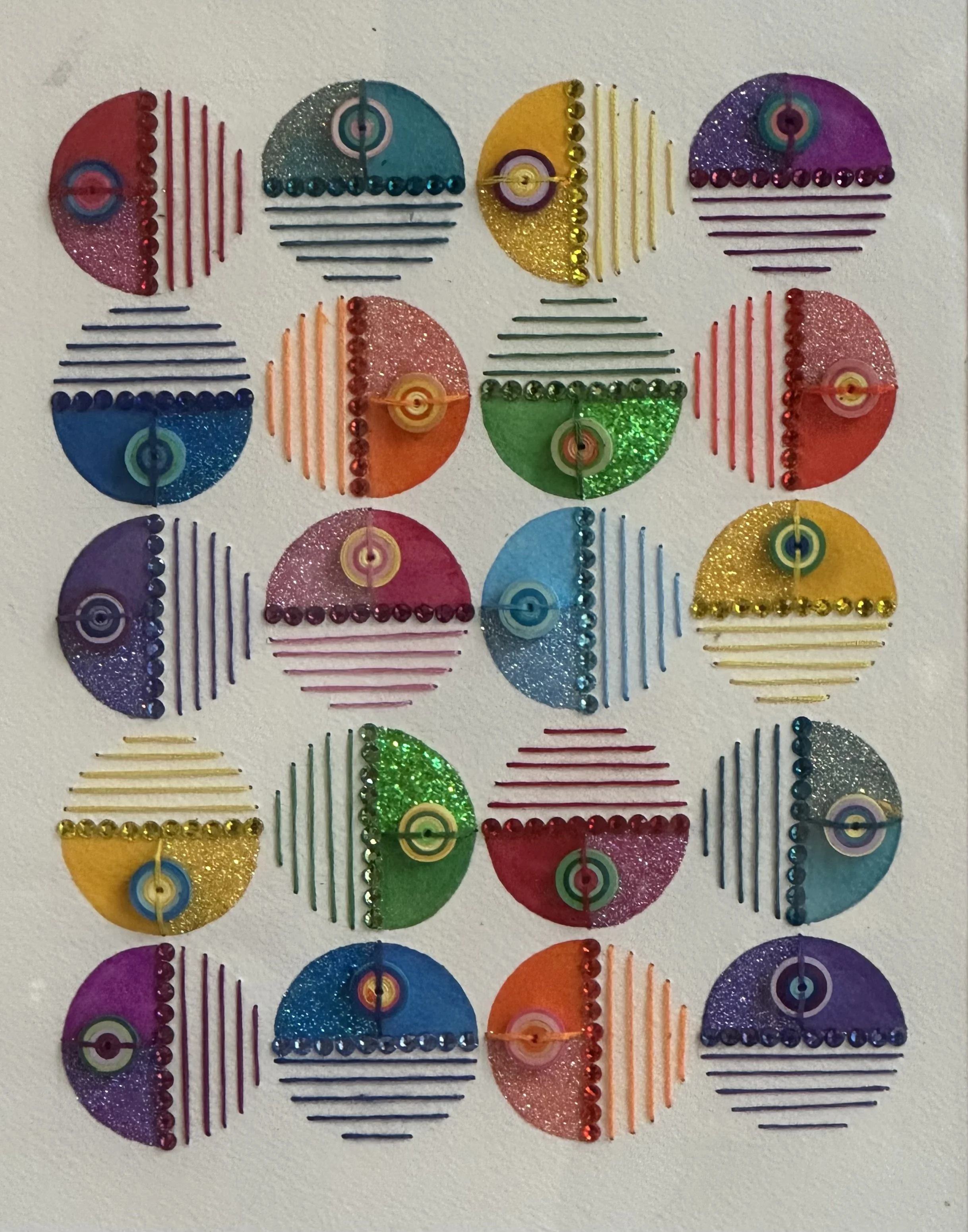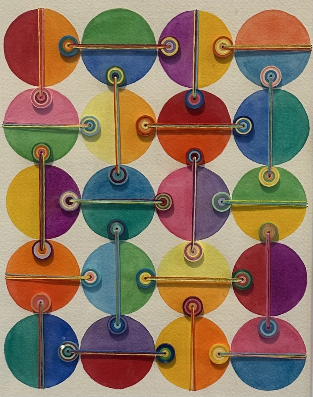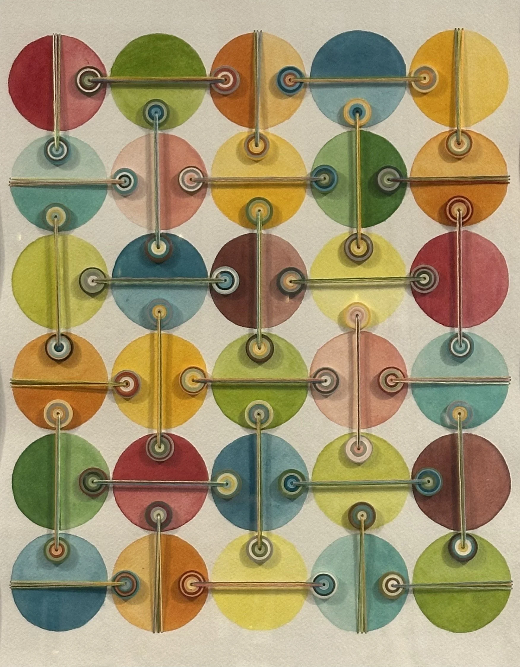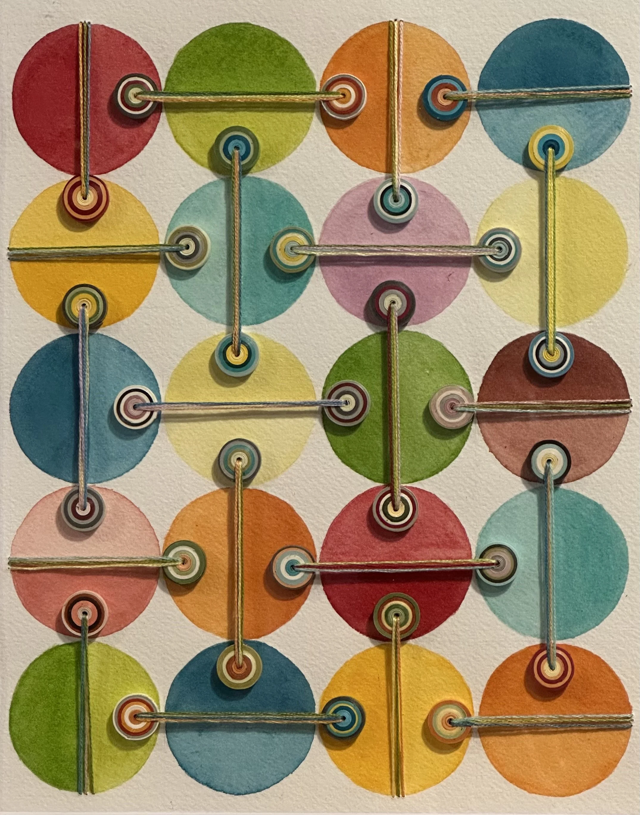 I am a mixed media artist living and working in Chicago. I am passionate about creating artwork that incorporates traditional fiber arts of quilling and embroidery with watercolor paint. I have an unrestrained love of color and the joy it brings. Each painting begins with shapes and layers of watercolor. During the final phase of the piece, I add a layer of fibers, buttons and quilling papers onto my painted watercolor designs to give energy and life to the patterns and shapes.