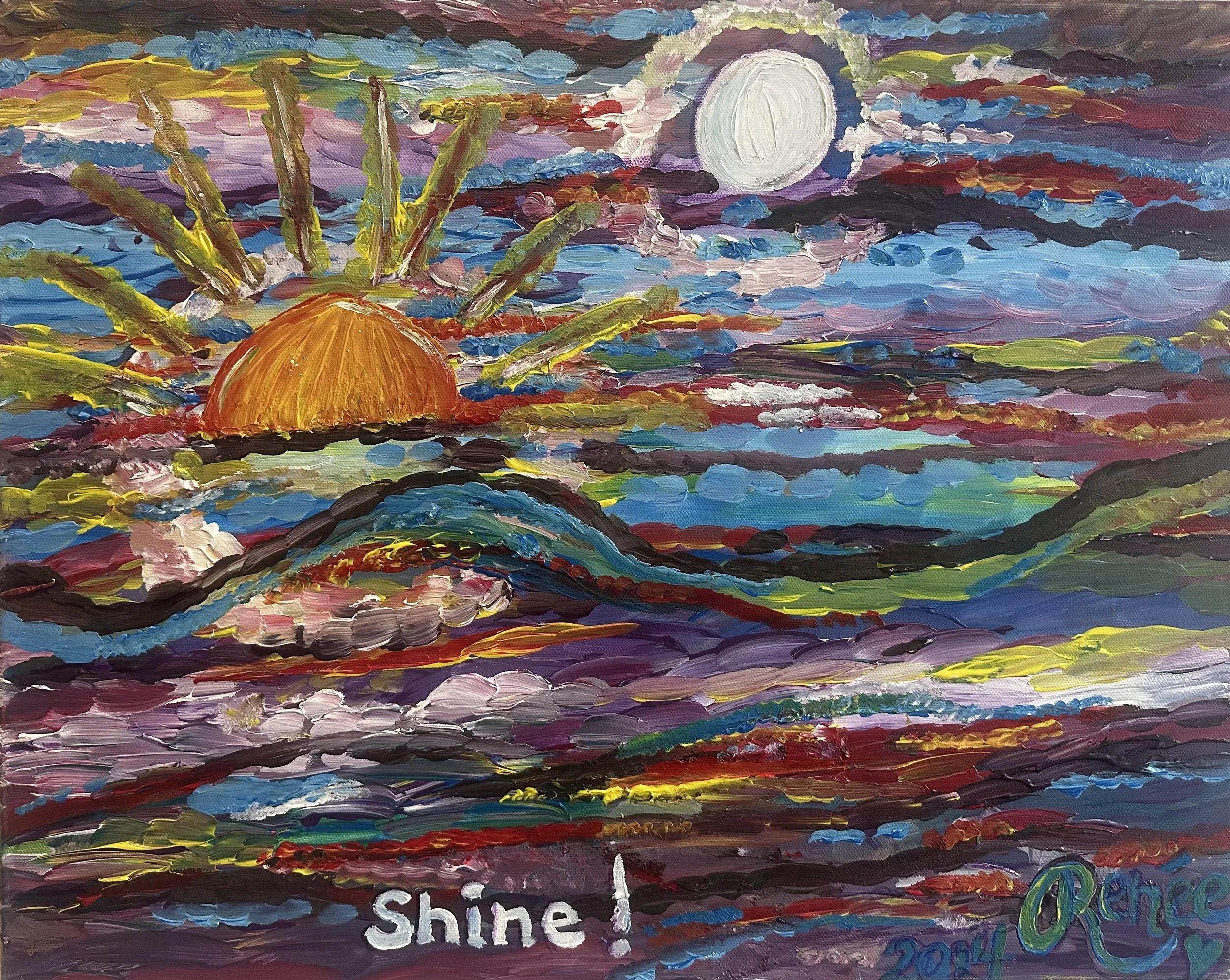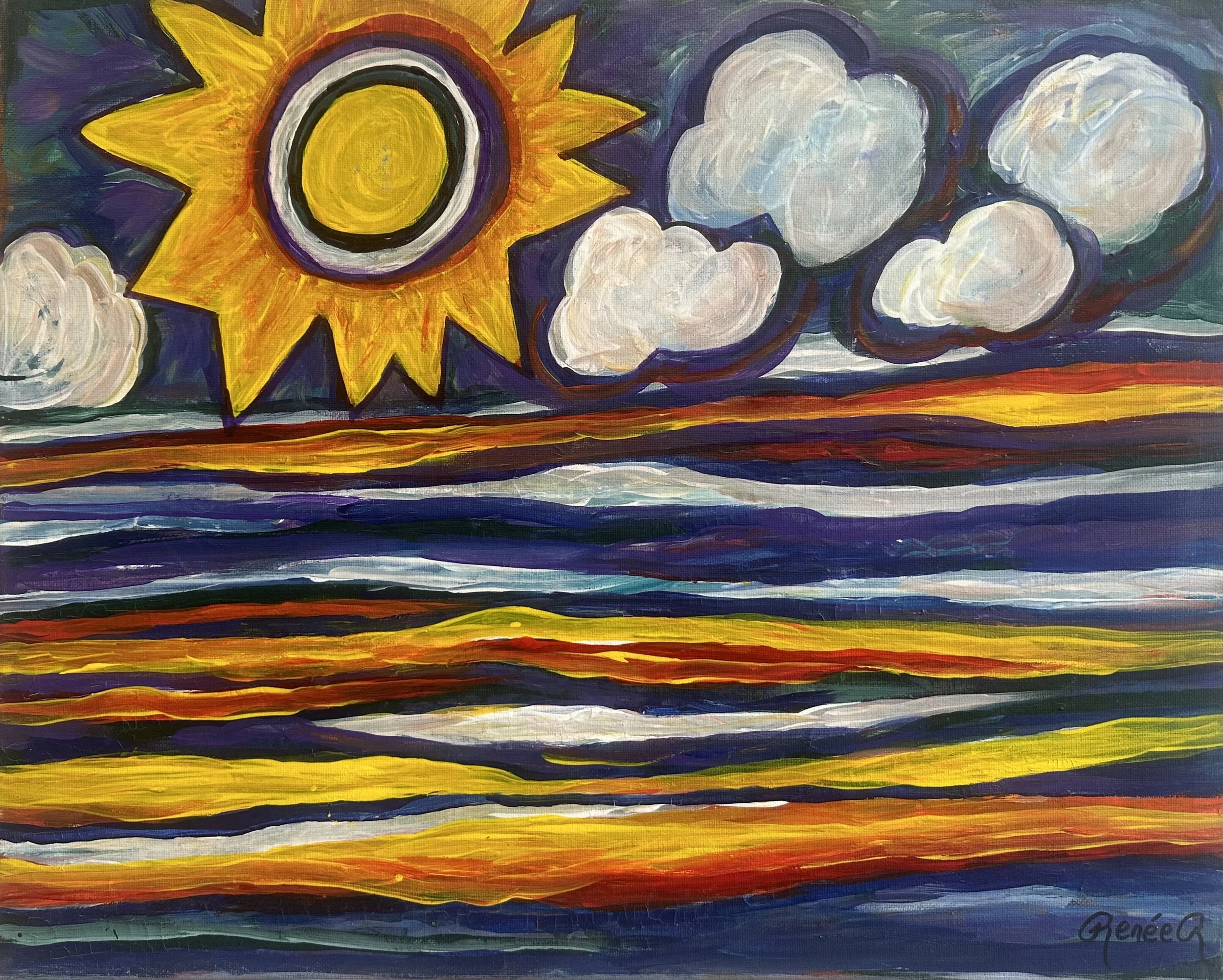 Renee Roos paints from her large back yard in Chillicothe, IL and from her campground in Victoria, IL. She creates paintings with acrylic on canvas or wood, often without cleaning her brush between colors. She takes inspiration from the sky, the flowers, and the colors of summer in Illinois.